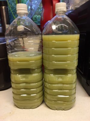 次郎柿の摘果した青柿をミキサーでつぶし越して作りました。今の時期でないと作れません。染物や防腐剤としても使えこれからどのように使うか考えます。いつでもできる事ではありませんのでとりあえず作っておきます。