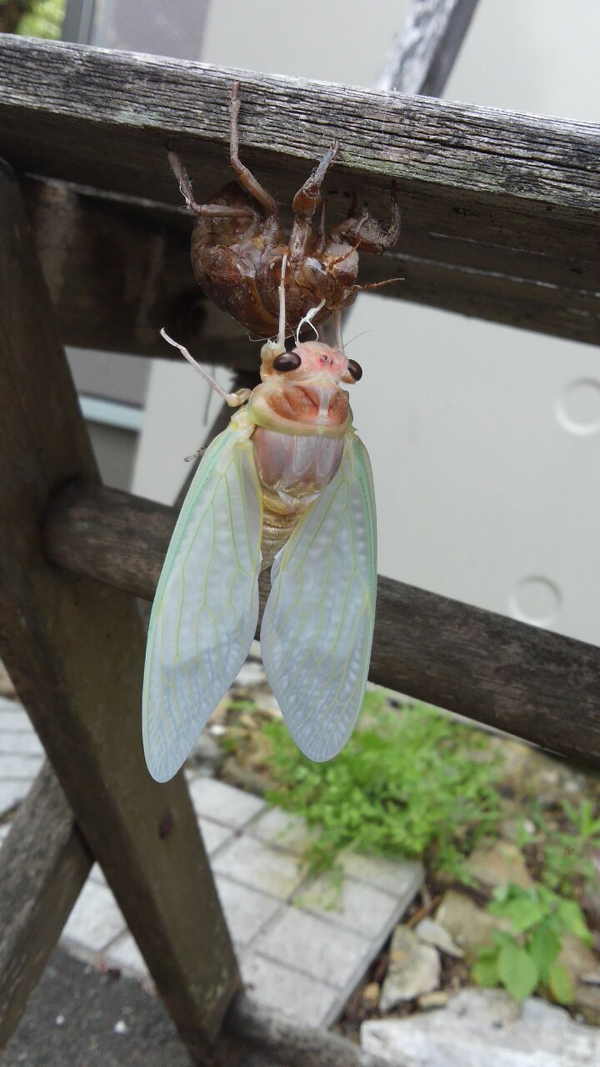 今朝庭でセミが羽化していました。 イスに5匹ほど止まっています。